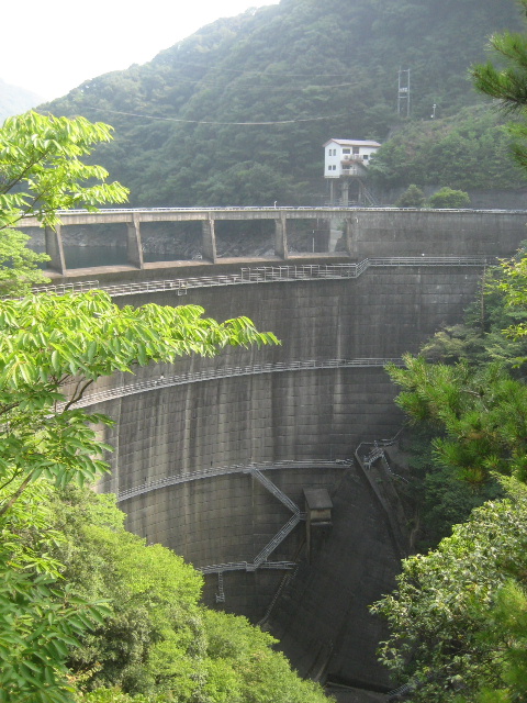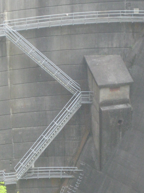 一面、コンクリートの塊といった感じのダム下部。その中ほどに直方体の小屋がへばり着いている。多分監査廊の入口だろう。