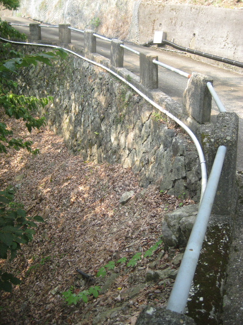 コンクリート斜壁の上部に分厚い壁のようなものが見える。