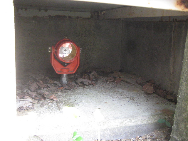 これは光波測距儀向けのもので、直接テープを張れない長距離間を測るときの必須アイテムである。遠方からプリズムに向けて光波を飛ばし、反射して測距儀に戻ってくる信号状態を検出し距離を割り出している。プリズムは入射方向へそのまま返すような角度でミラーが設置されているので、どこから撮影しても私のカメラが写るわけだ。実務ではこのようにプリズムだけを固定設置することは稀で、長い棒の先にプリズムを取り付け、測量者の指示するポイントへ移動し棒を垂直に立てて測距する使い方が一般的だ。