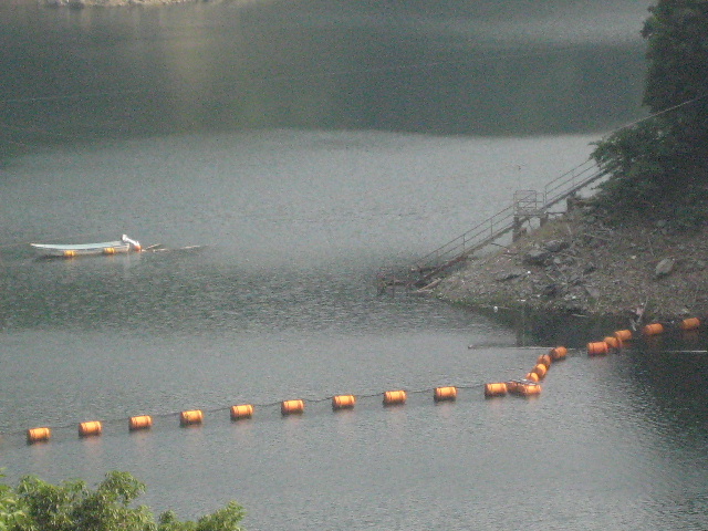 貯水率がそんなに下がっているわけではないが、斜面の土肌が目立っている。水位が下がった分だけ網場の一部が斜面に乗っかっていた。