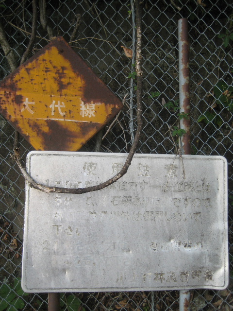道路標識を模した菱形の看板には林道大代線の文字が読み取れた。