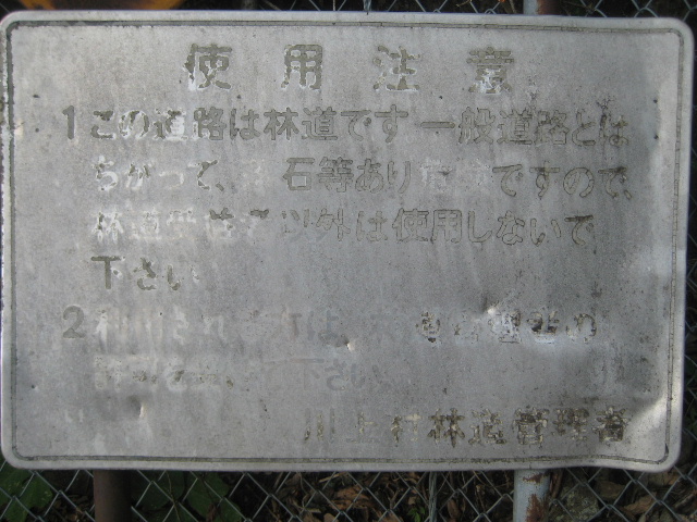 あまりに古びて文字も読みづらい。注意書きによれば、林道は一般道路と異なり受益者以外は無断で通れないこと、通行には許可が要るということが示されていた。
