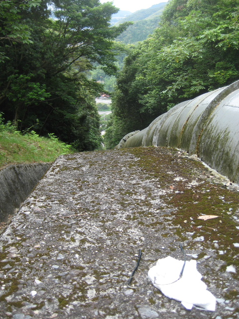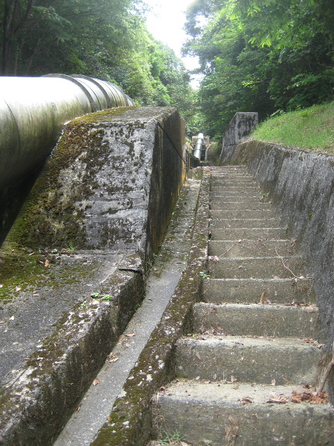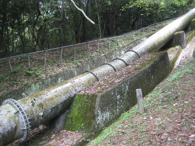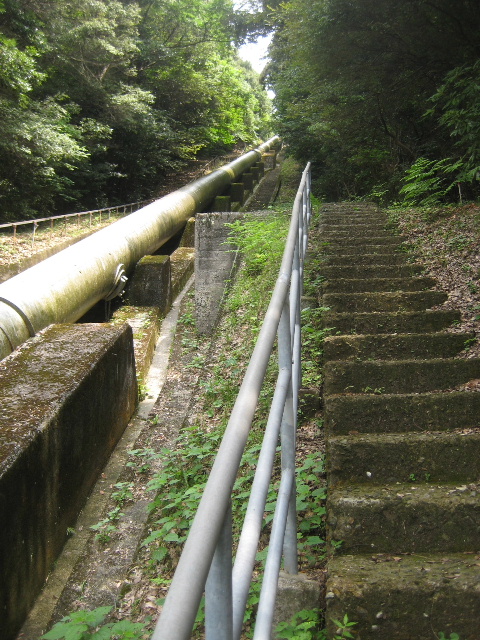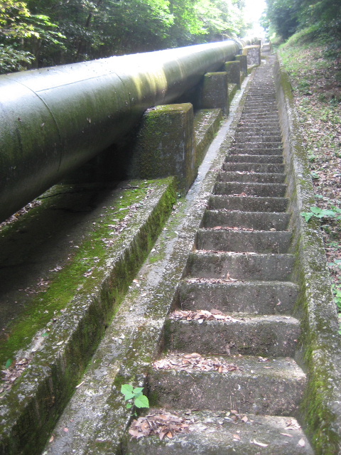 長門峡発電所などで観てきた水圧鉄管は、口径が太く直線的に設置されていた。対してここ間上発電所の水圧鉄管は、至る所で勾配が変動していた。