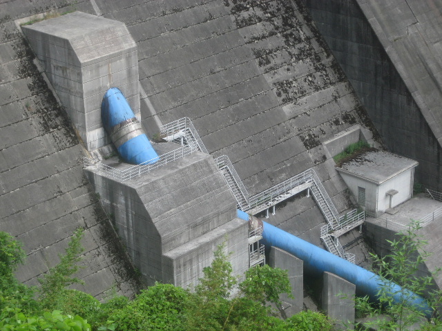 ・発電建屋に引き込まれる水圧鉄管は、ダム背面から眺めたとき斜めから差し込むような形になっている。