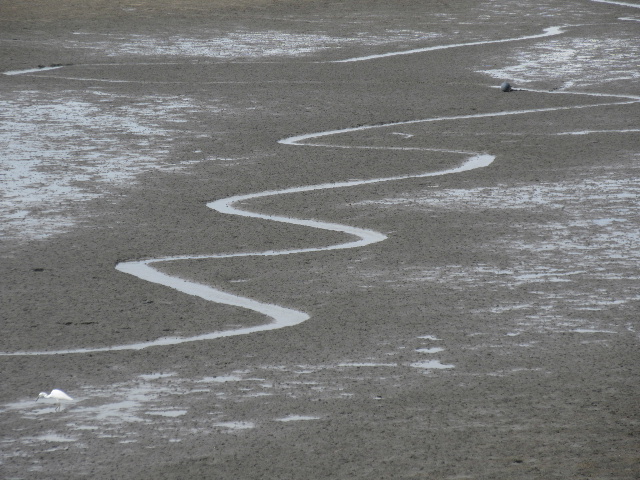 満潮時には全部が隠れて両岸に接する一本の川になる。しかし…水面下でこのぐにゃぐにゃ曲がりは一定に保たれているようで、干潮になれば再び全く同じぐにゃぐにゃ経路が現れて少量の水が流れるようになる。ちなみに遠景で後ろに見える琴川橋は部分的に落とされ変形している。