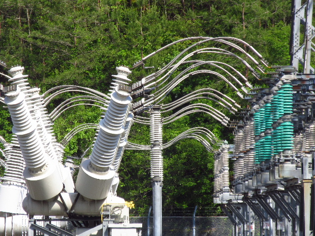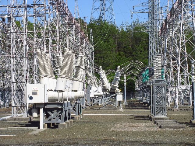 碍子と遮断器を結ぶウニュッとした曲線。山口変電所での撮影。(遠景・近接)
