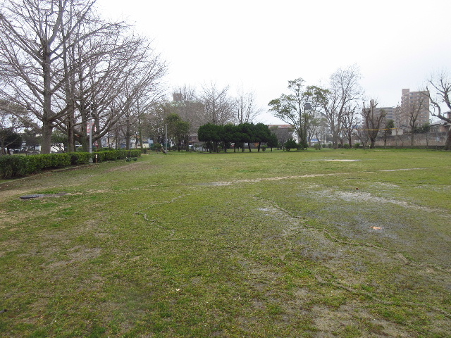 雨上がりの鵜の島公園の芝生。(遠景・近接)