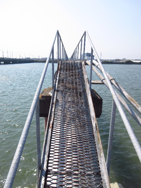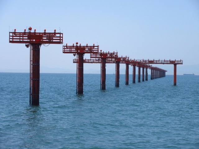 八王子漁港から写した山口宇部空港の誘導灯。誘導灯がズラッと並ぶように少し離れた護岸からズーム撮影している。この形状と色調が怖いと感じる人も居る。[1]