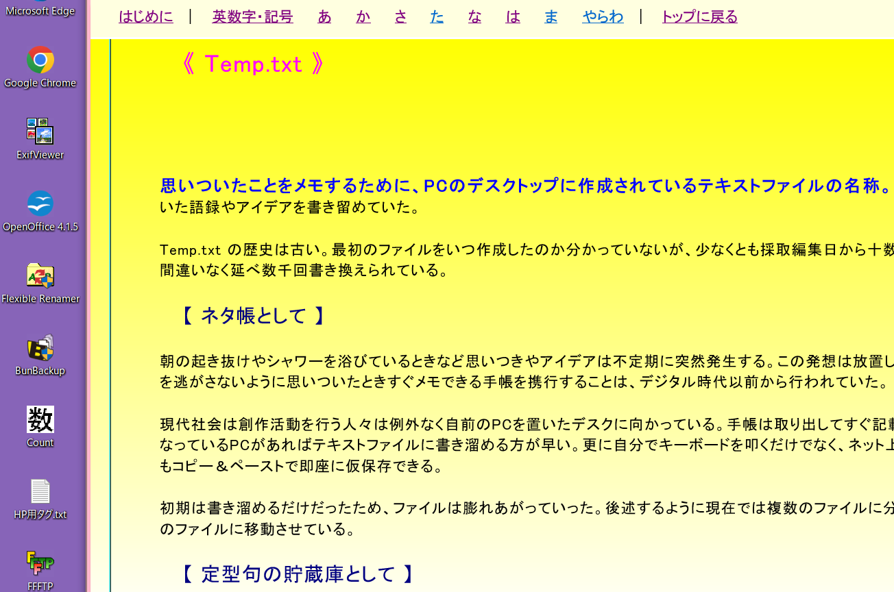 Temp.txt の歴史は古い。最初のファイルをいつ作成したのか分かっていないが、少なくとも採取編集日から十数年前である。単一ファイルで運用していた時期は、間違いなく延べ数千回書き換えられている。