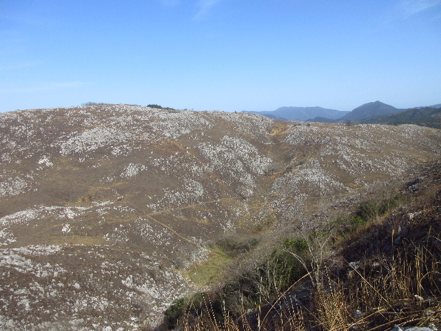 カルストロードの途中に、秋吉台の地下水位変動が可視化される帰り水という場所があります。壮大な窪地になっているので、地下水位が上昇すると湖状態になり、低下すれば干上がります。数台車を停める場所があったので、ここでかなりの枚数を撮影しました。写真は駐車帯付近から撮影した帰り水周辺です。