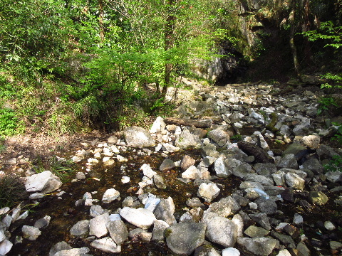 このおふく洞自体驚くべき存在です。自然河川が山の方に向かって流れ下り、最後は直径数十センチ程度の穴へ吸い込まれていきます。足元は礫石が散乱していて、表流水だったのが下っていくにつれて伏流水に変わっています。穴の周辺ではもう流れる水が見えません。遙か昔から注意深く観察されていたようで、於福の道の駅がある周辺の小字名である入水(いりみず)に現れています。