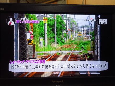 実は先月21日に現地ロケを終えていました。1日が市制施行100周年の日でしかもちょうど週明けの月曜日です。この日からの放映に間に合わせるために編集作業はかなり大変だったでしょう。現地の私はしゃべりながら歩くだけでしたが…最後の方で宇部線の新川橋りょうについて2つのコアなネタを話しています。昭和27年に起きた真締川東踏切での列車とトラックの衝突事故と、昭和32年に行ったと思われる橋と線路の嵩上げです。写真は私が現地で撮影した画像が番組内で使われたところをテレビ越しに撮影したカメラ画像です。
