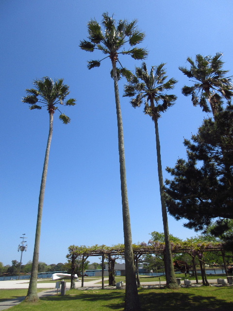 ときわ公園のペリカン島に面した半島に植えられているひときわ背の高いシュロのような樹木は、ワシントンヤシである。