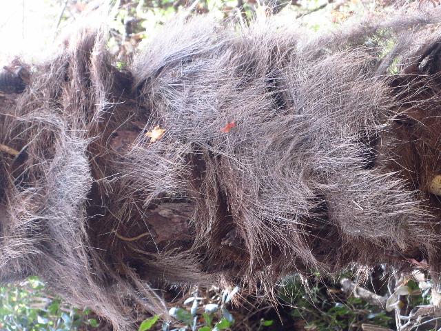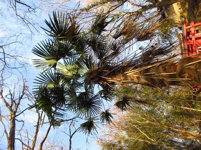トウジュロは真っ直ぐに伸びて一番高いところで扇を開いたような特徴的な葉をつけるので、遠くからでもかなり目立つ。枝分かれせず上へ上へと伸びた後で、幹の部分が箒などの材料にも使われるシュロ皮となる。