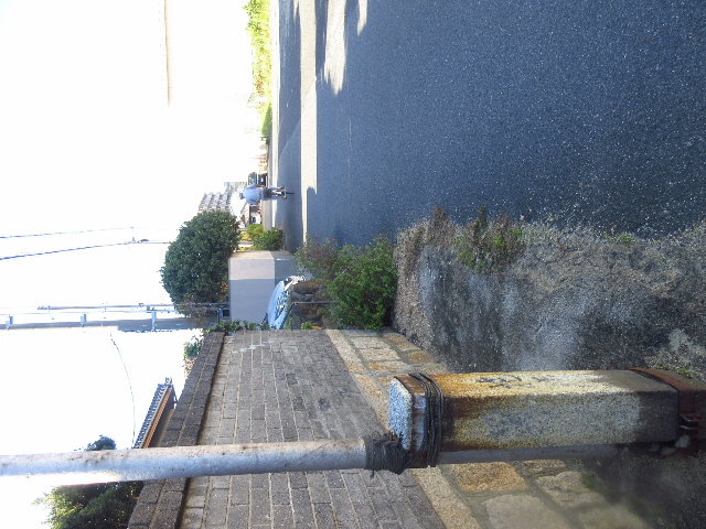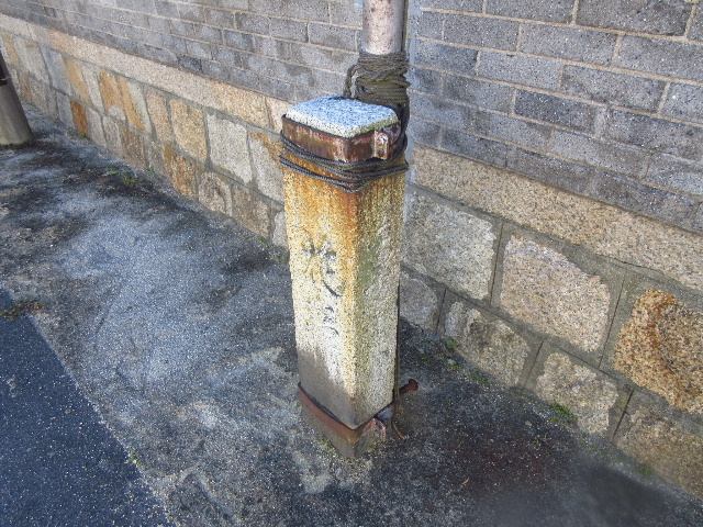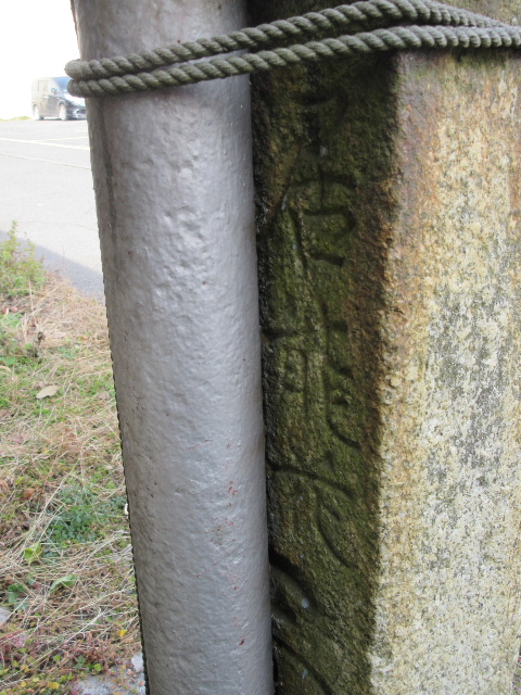 金属ポールは明らかに後付けで、石碑の2箇所をクランプ状の鉄材で挟み込むように固定されている。耐久性のあるロープが取り付けられていて、国旗などの掲揚に使われていたようである。