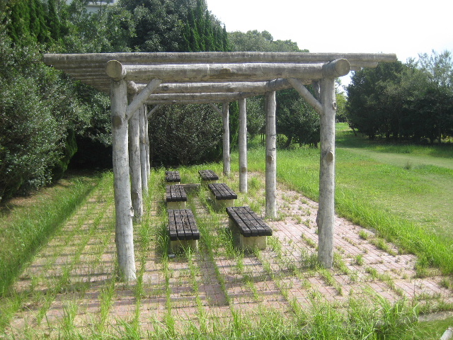 ベンチの集まった一角には自然の材木を組み合わせた柱が建っているのだが…屋根がない。こういうデザインなのかも知れないが、これでは日差しを防げない。後からフジを絡ませて藤棚を造ろうとしたのだろうか…