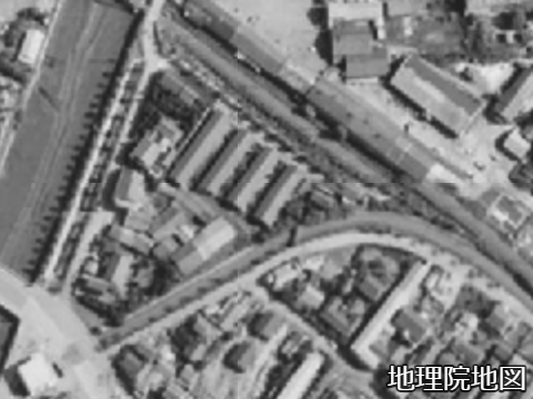 現在マンションが建っている場所に、線路とは直角の方向に4棟の長屋のような建物が見える。しかし現在市道春日町線および春日公園となっている部分には何もない。この時から既に線路からは離した余剰地があったこととなる。昭和40年度初期に撮影されている航空映像でもこれとほぼ同じ状態だった。