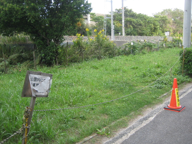 それでも市の管理する公園だという推測がつく。そのことは市道と緑地の間に置かれた駐車禁止のセフティコーン、乗り入れ可能な部分に張られたトラロープから分かる。市道を駐車場代わりに使うのと同様に、緑地の中へ車を突っ込んで停めるのも阻止したい意図が読み取れる。