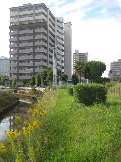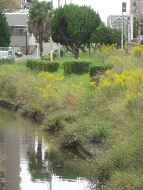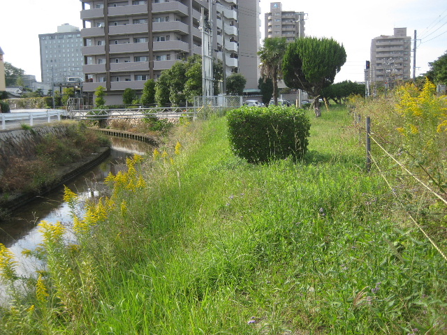 橋の接続部分付近では宇部線と塩田川の間に柵はなく、ただ草むらが見えているだけだ。