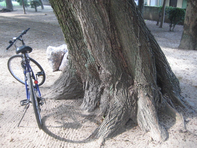 この木などとりわけ太く年季が入っている。自転車と比べても幹回りの太さが分かるだろう。