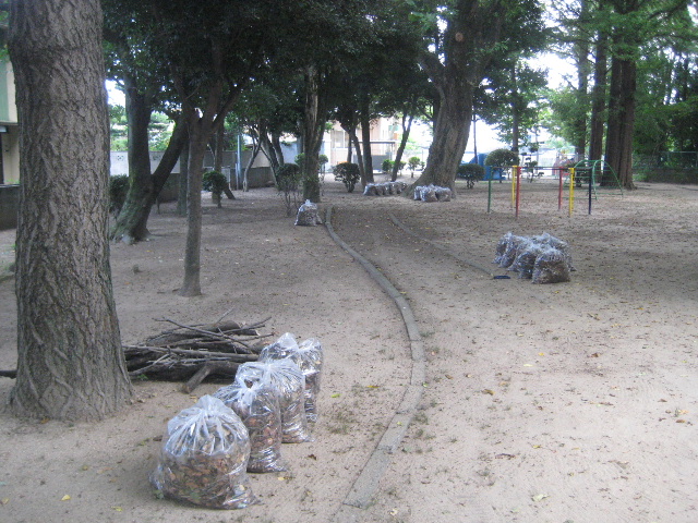 私が訪れたとき、園内の清掃が一通り終わった直後だったらしい。枯れ枝は一箇所にまとめられ、落ち葉はビニル袋に詰めて搬出のときを待っていた。