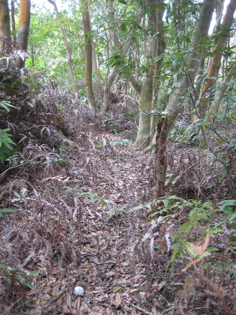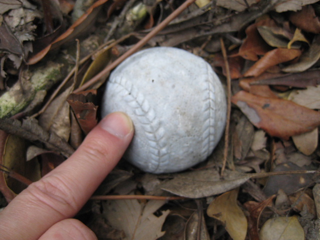 沢の先端を横切って引き返すとき、どういう訳か落ち葉の上に野球のボールらしきものが転がっていた。