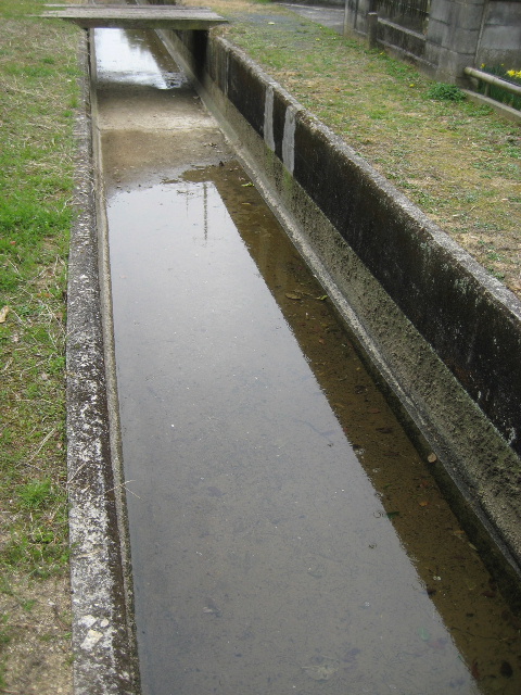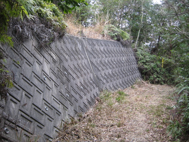 メインの道は急な下り坂で上の水路との間に練積ブロック擁壁が築かれていた。これは少なくとも昭和後期の施工だろう。