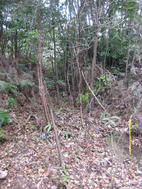 すぐ左側山手に黄色いタグが結びつけられているこの場所だ。門前池に向かう分岐のすぐ先である。