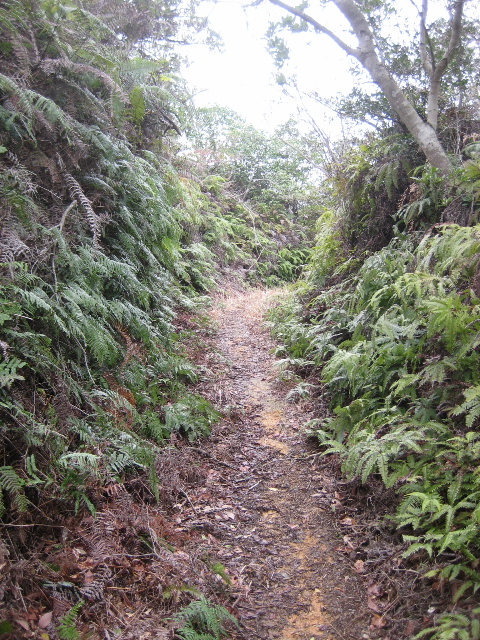 実際には道ではないと安易に断定はできまい。進行方向にまばらな樹木があるものの足元がシダ類で覆われて踏み跡が判然としないだけだ。かつては遠足で児童が普通に歩けた道であろうが数十年も人が踏み込まないならこの程度に荒れるのはむしろ普通だ。