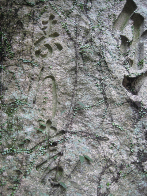 現地での撮影は結構難渋した。巨岩は山の斜面に鎮座しており、この文字が彫られている側は地山が大きく崩れていた。周囲が暗いのでなるべく同じ高さで近くから撮影しないと文字が鮮明に写らない。