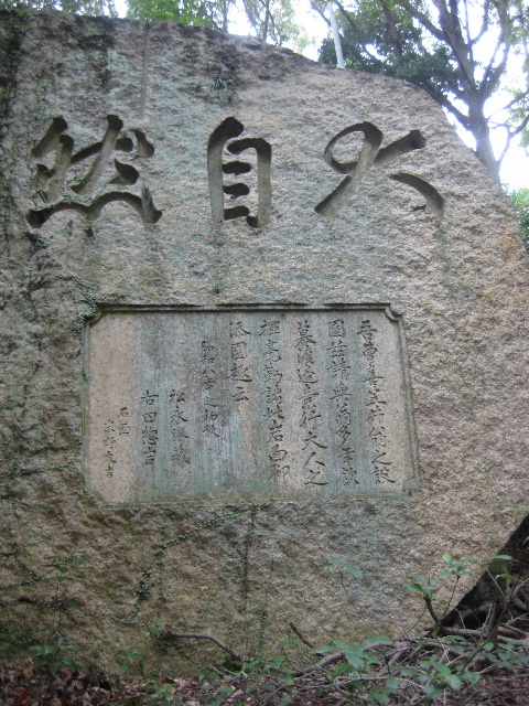 我々友人は笠井翁の設園を喜び、ここに翁が多年慕い敬ってきた渡辺素行大人に揮毫のお勤めをお願いした。この岩面は些かなりとも園に趣を添えるものである。