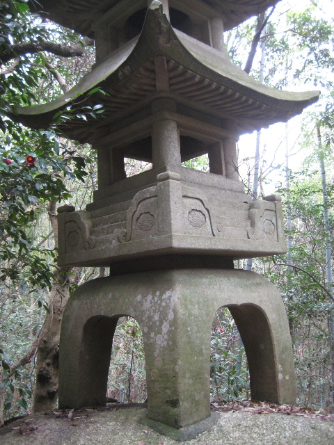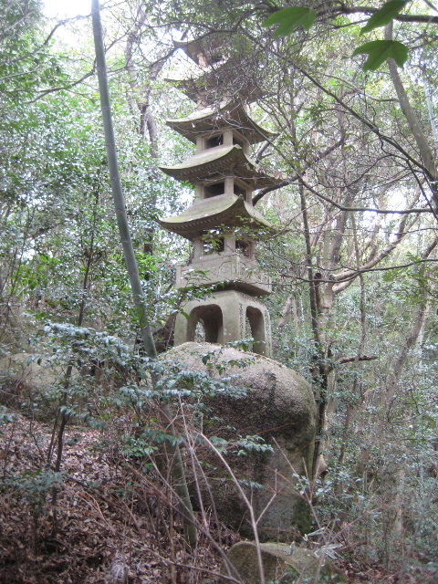 木々が立ちこめて薄暗いためここからでは広場横の池は見えない。逆に広場からはこの巨岩や五重塔は殆ど見えない。