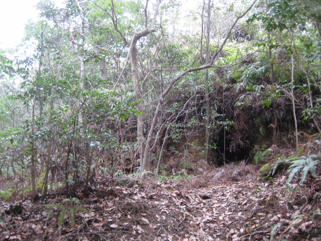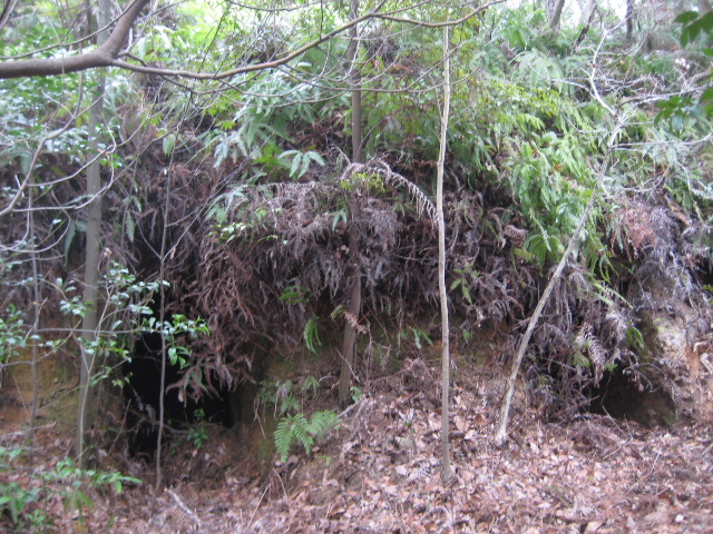 今まで歩いてきた道の正面に空いた穴の右横に同じような穴が見えている。どちらもほぼ同じサイズで、入口部分はシダ類で覆われていた。傍目にもかなり古い。