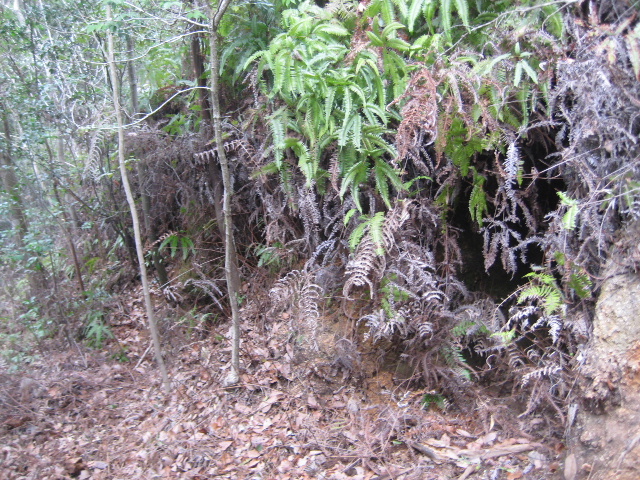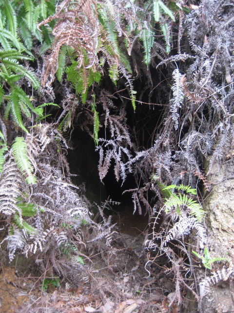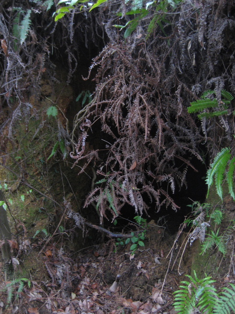 自然にこんな穴が出来ることはまず考えられない。シダで隠されて見づらいものの断面はかなり整っており、倒木で自然にできた洞(うろ)とは違う。まして同じ穴が偶然2つ横並びになる筈もない。