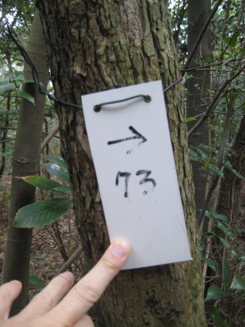 近くの幹に結わえ付けられていた特高線の73番鉄塔の所在を示すタグ。