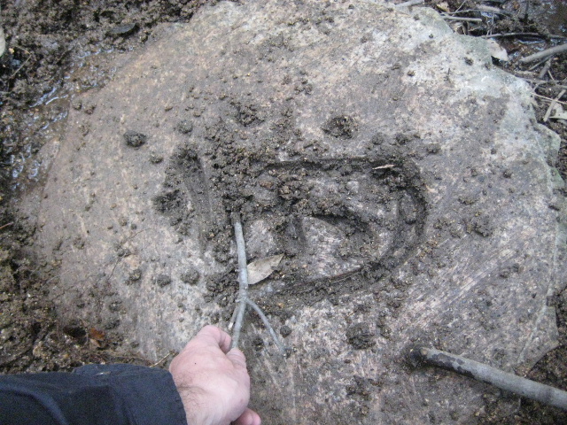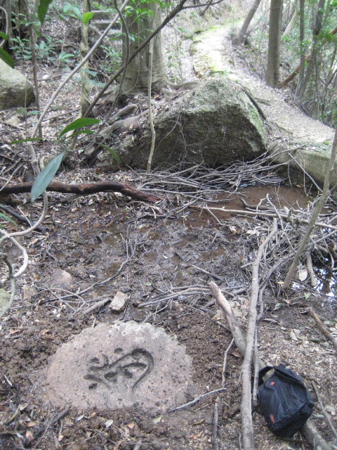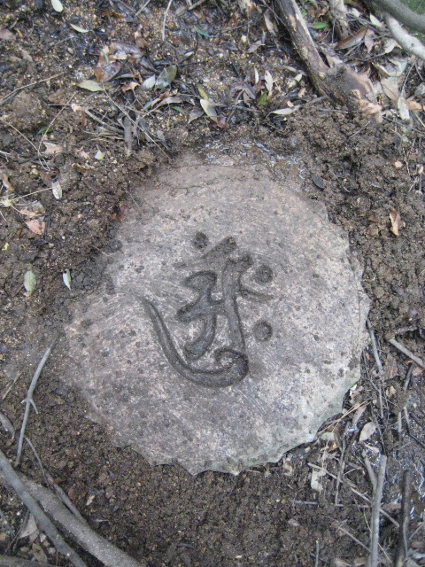 石に刻まれた梵字は一文字のみで、太く力強く陰刻されていた。彫りの細かな部分にもシルトがみっしり詰まっていて取り除くのには堅めの小枝が必要だった。洗い流すための充分な水が確保できないので、読み取れるようになるまで根気強くほじくった。