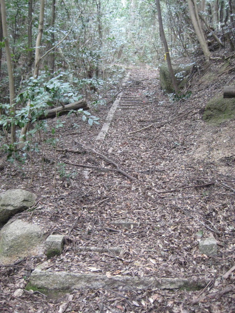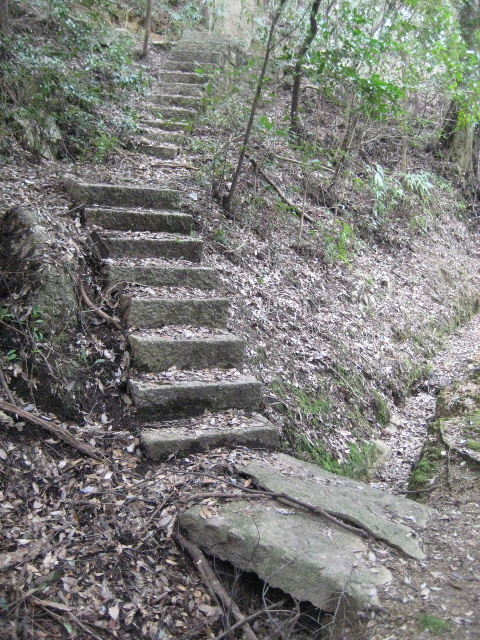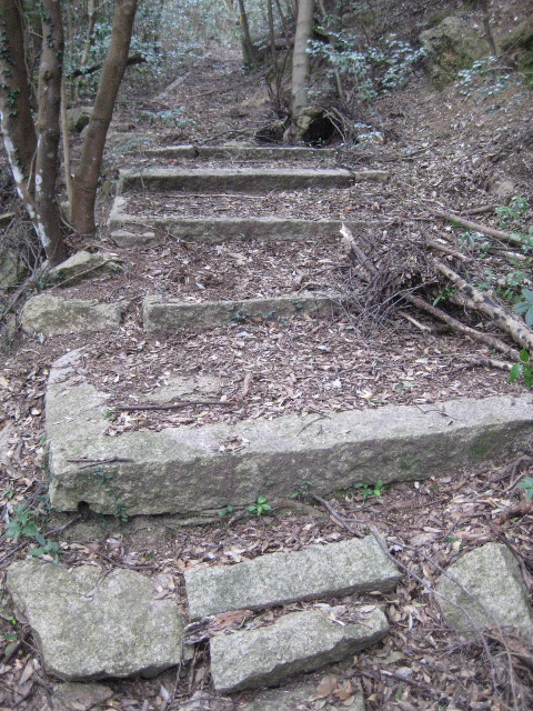 一定勾配でかなり長い。殆どが木の葉や土砂に覆われているので推測でしか段数を記録できなかった。