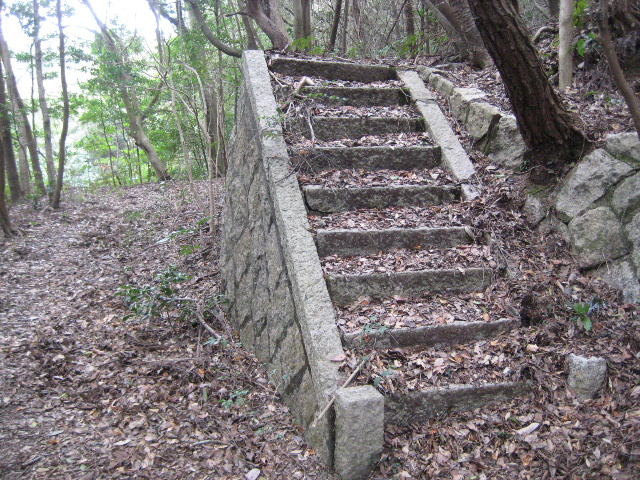 傾斜が緩い区間は石段の間隔も広い。角柱状に加工した石材を横置きにしている。