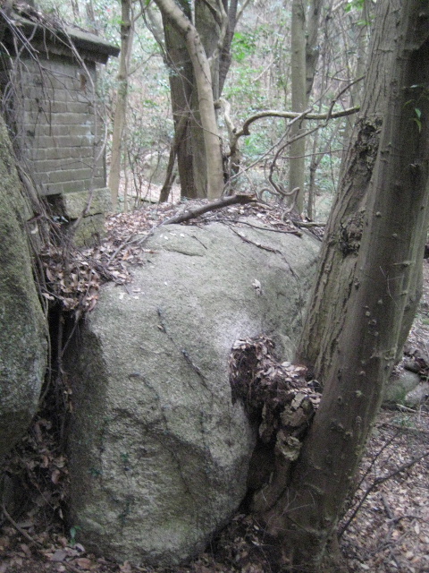この巨岩の園路側に面するような形で祠が存在していた。