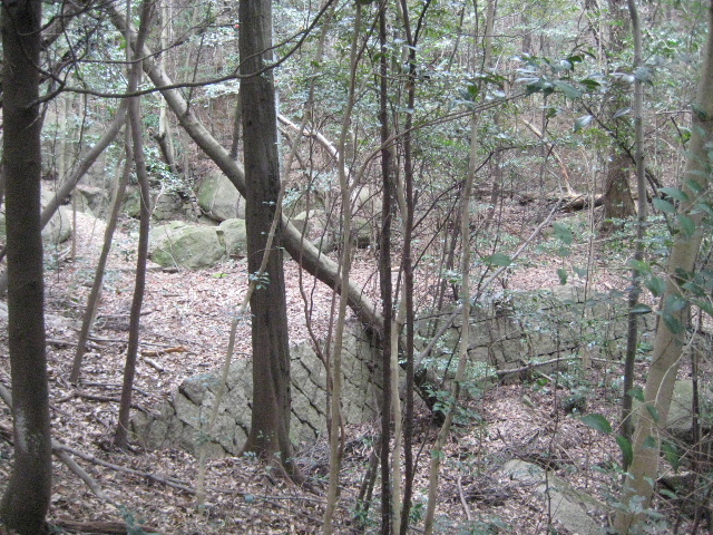 藪の向こうに石材が積まれている。