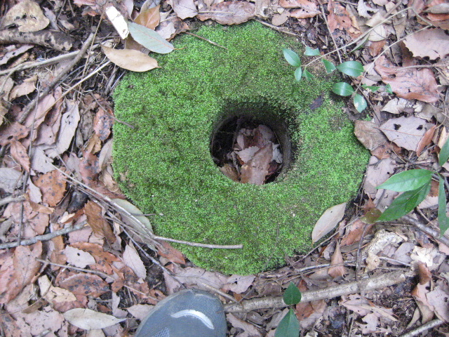 井戸らしきものの右側にある岩は柱状の石で支えられており、接合部にはモルタルの痕跡が認められた。上の岩を人為的に持ち上げて土台に別の岩を押し込んだようだ。何のためなのかはもちろん分からない。