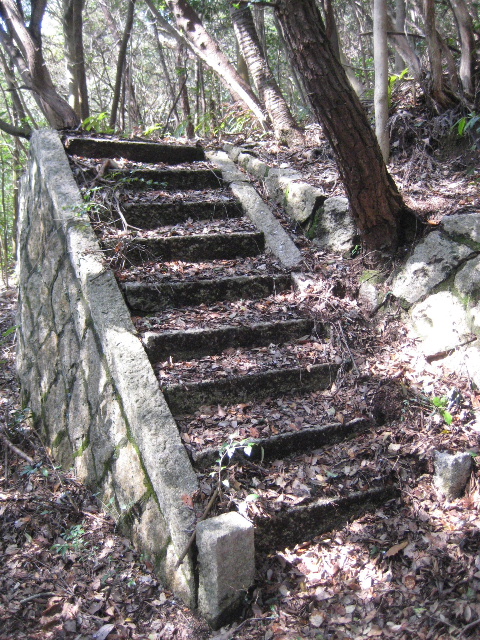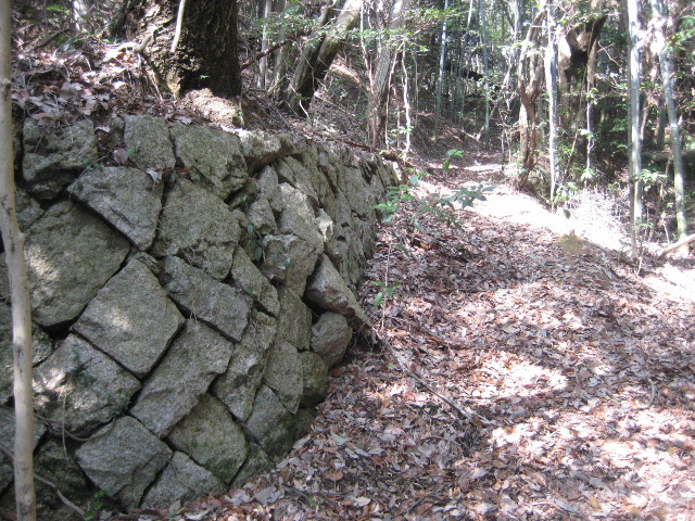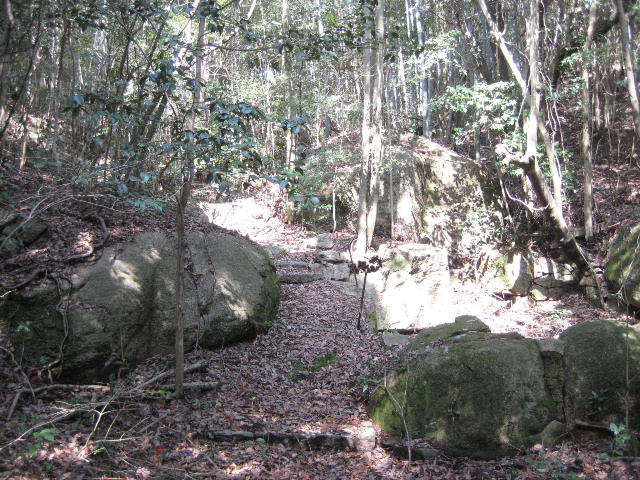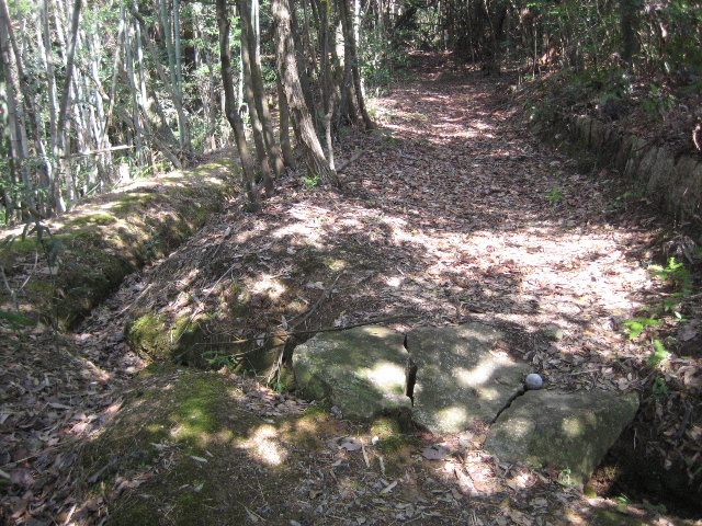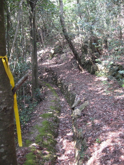 やはりどなたかが確認のために石段へ積もった木の葉を若干取り除いたようだ。この先にはかなり大きな石積みがあり、道となる部分は石積みが空けられている。それにもかかわらず明白な遺構はなく何処にも繋がっていない現在のところ未解決の経路である。