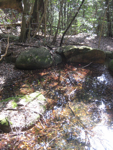 第三次踏査の最初に見つけた緩衝池にある梵字の石盤。今から思えば全くの偶然によって目に留まり掘り出された遺構だ。