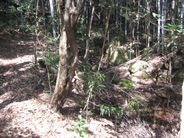 上池には第三次踏査で見つけたウィスキー瓶型の石灯籠が据わっていた。肉眼ではまったく明白なのだが、少し離れて撮影しただけで何処にあるのか写真から見つけ出すのはちょっとしたパズルだ。
