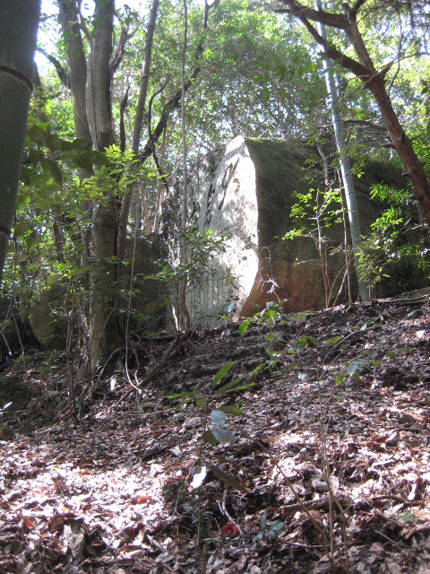 結局、大自然の文字と側面の短歌が読み取れる場所からの撮影はできなかった。巨岩自体が斜面の上部にあり下から見上げる形になること、周囲の藪が酷く眺めが制限されることが原因だった。