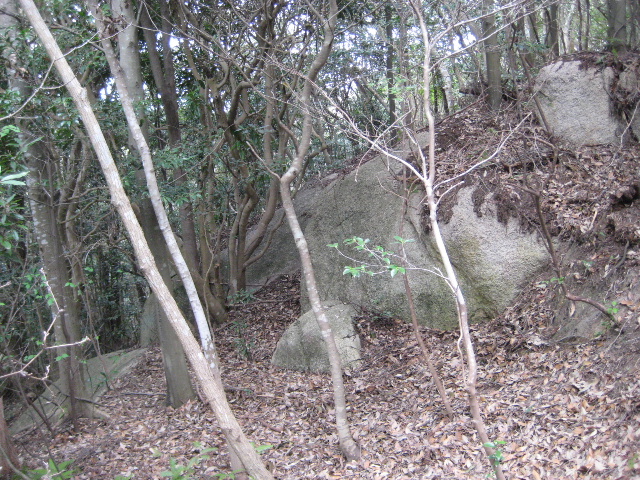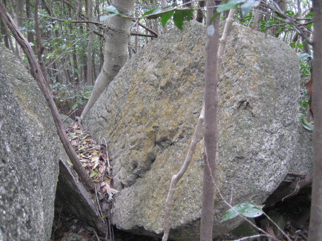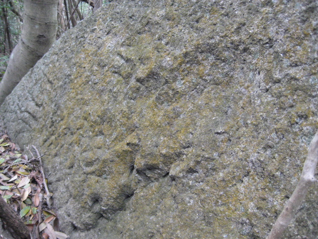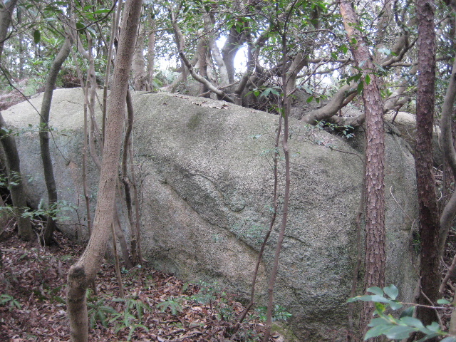 尾根のピーク付近に到達したところで再び藪の中に大きな岩を見つけた。この程度のサイズの岩ならもう飽きるほど観ていたので、最初は殆ど頓着しなかった。