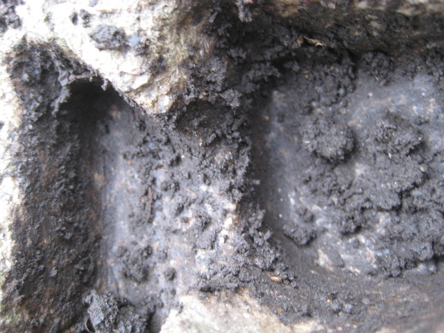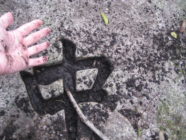 腐葉土状態の土は木の枝や手に粘り着き、石碑の上にも散らばって今度は取り除くのが大変だった。
