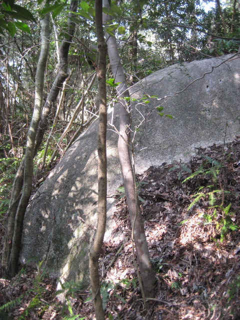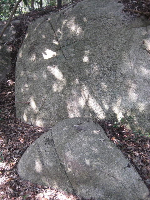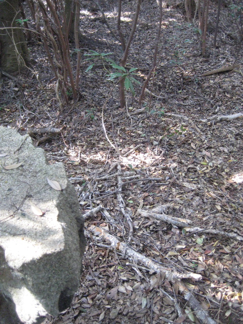 巨岩の下の石材といいこの特徴ある筋がある岩といい、後から思えばこれほど一致するものを目にすれば早々に気が付きそうなものだろう。しかし現地の自分はなおも同じ場所と確信できずかなり混乱した。初回に踏み込んだ場所からは一つ沢を隔てて充分離れた場所から登っており、同じ場所に到達する筈がないという思い込みがあった。