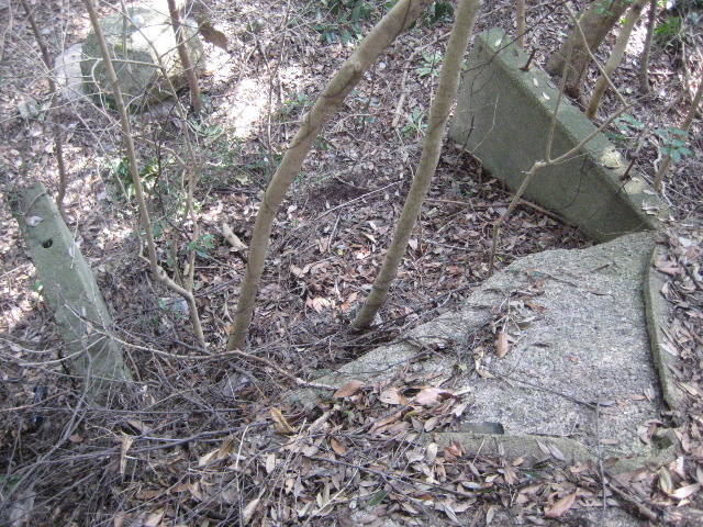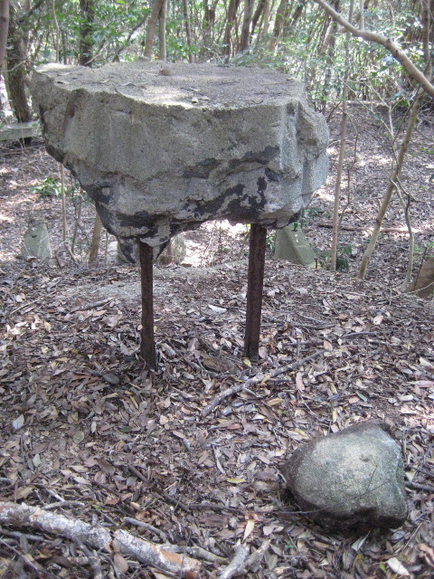 私は初回踏査の時からこの遺構の意味が分からず、テーブルか何かかと思っていた。K氏はこれを上半身部分の破壊された子安弘法大師の立像ではないかと推測している。付近に転がっている小さなコンクリート塊は頭部の痕跡かも知れない。