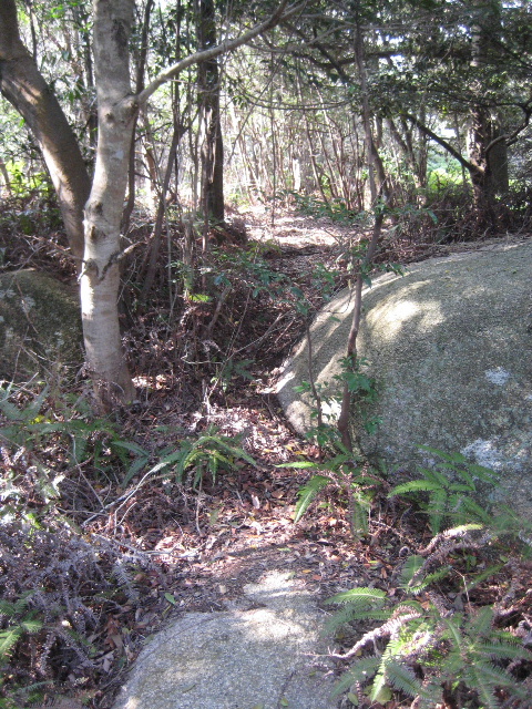 斜面を降りたところはいわゆる倒木峠で、以前からここが白岩公園の北の端と推定している。メインの道は倒木峠を過ぎてから先はまったく石段のない普通の山道になる。斜面の岩自体もかなり少ない。そこで今回もこの先に遺構はないと判断して法篋印塔のある側のピークに移動した。